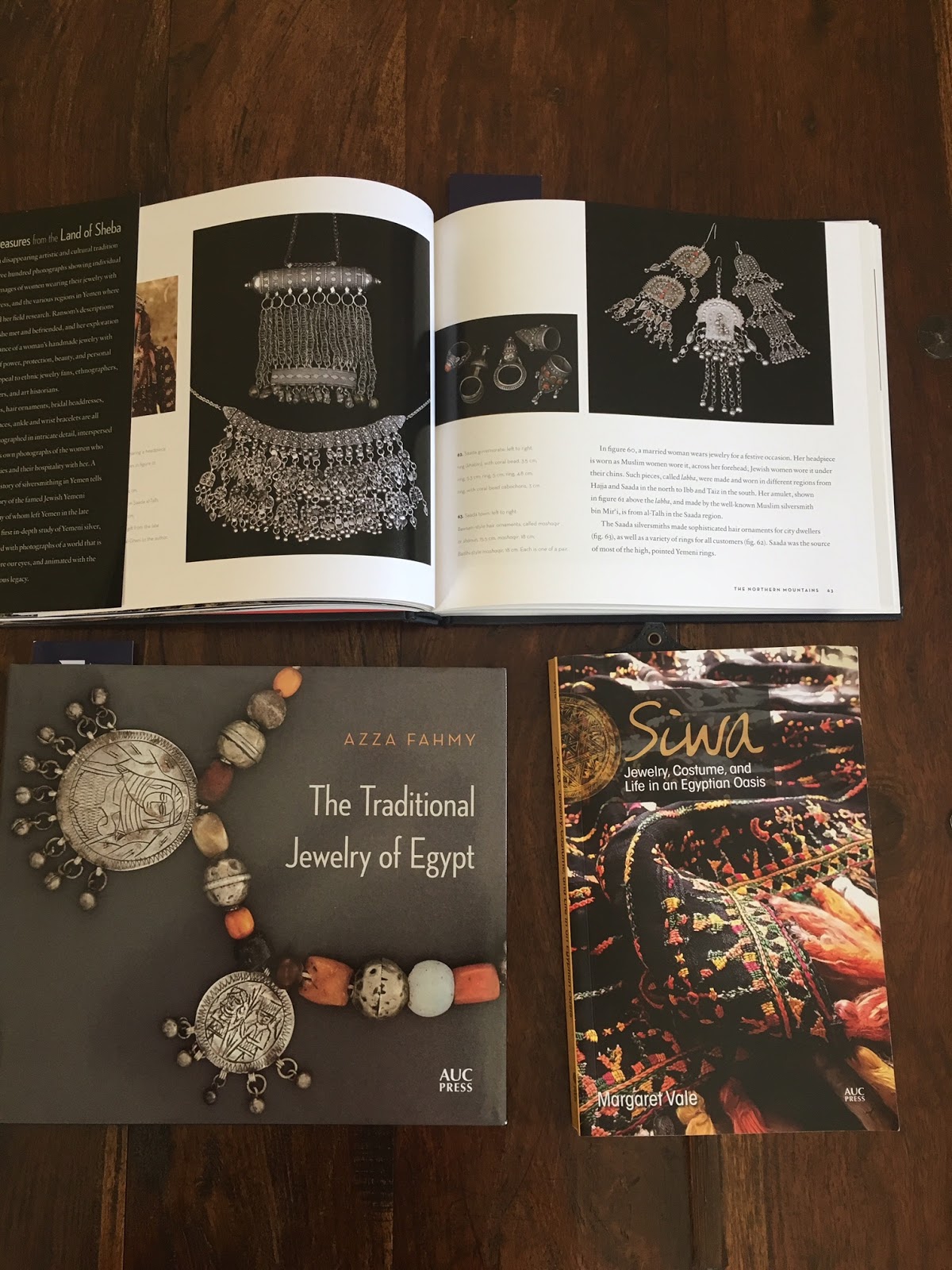 My hugely adventurous friend Penni actually planted the seeds in my bedouin interest with this book she gave me a year ago about Siwa (bottom right). After I bought my first piece of jewelry about two months ago I was happy to find these books specifically about bedouin jewelry. The open book at the top describes jewelry from Yemen. These fascinating books are my references and are filled with great photographs, as you can see.